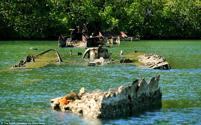 Мангровые деревья проросли через обломки миноносца японского императорского флота «Кикузуки» в Токийской бухте островов Нггела, Соломоновы острова.