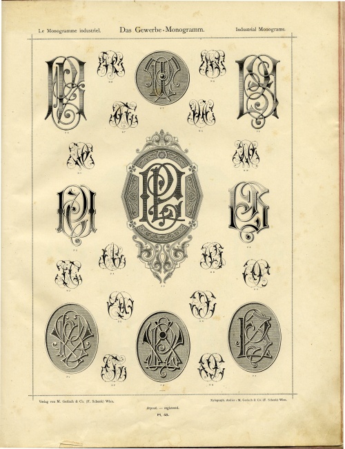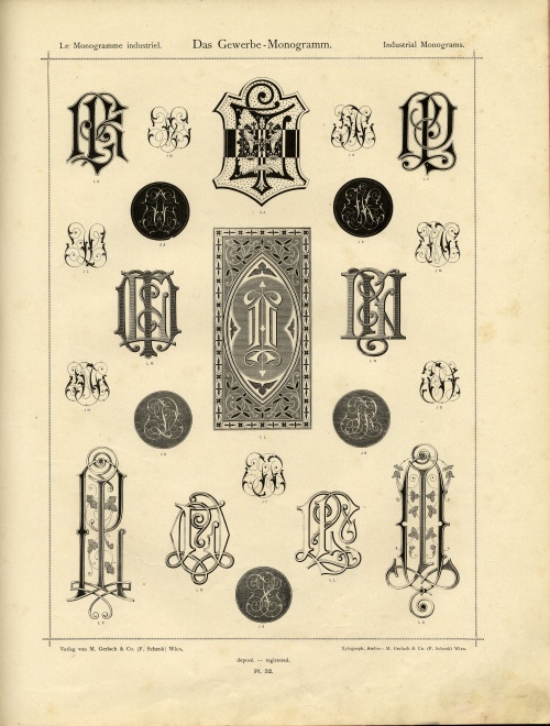 70 sheets with illustrations from the ancient Album of Industrial Monograms (Das Gewerbe-Monogramm / Le Monogramme Industriel). The sheets contain wonderful high quality images of monograms, monograms, fonts, decorative elements and heraldic attributes.