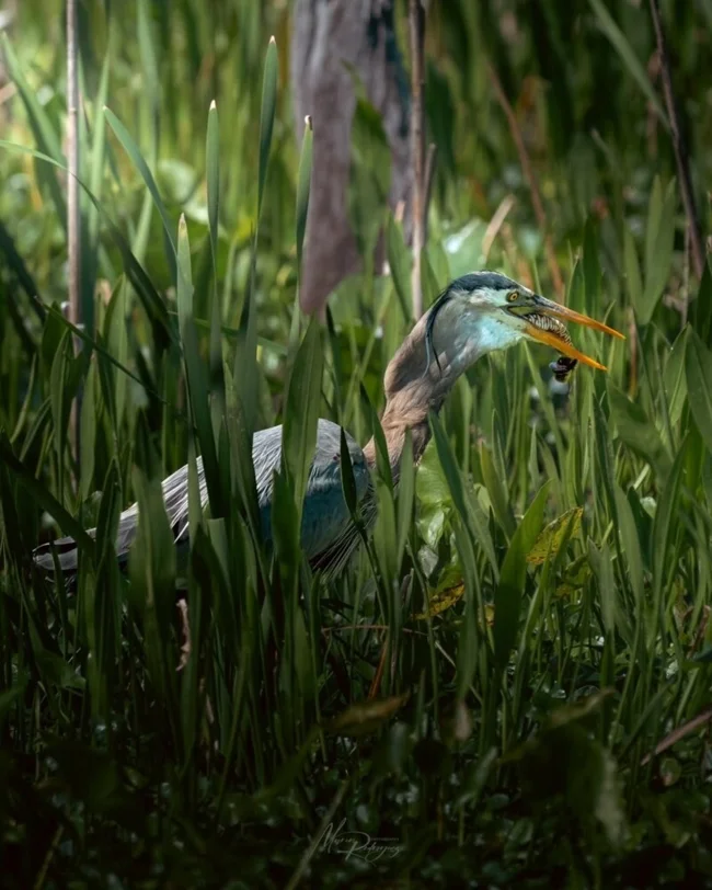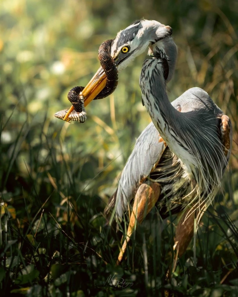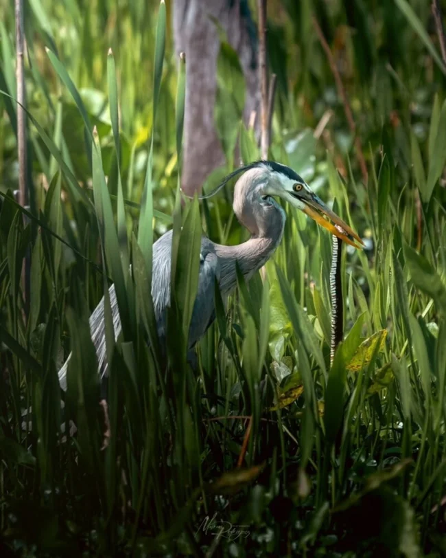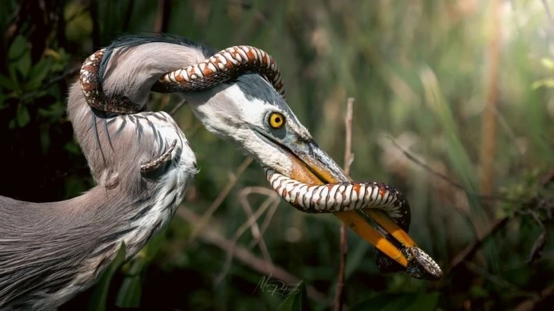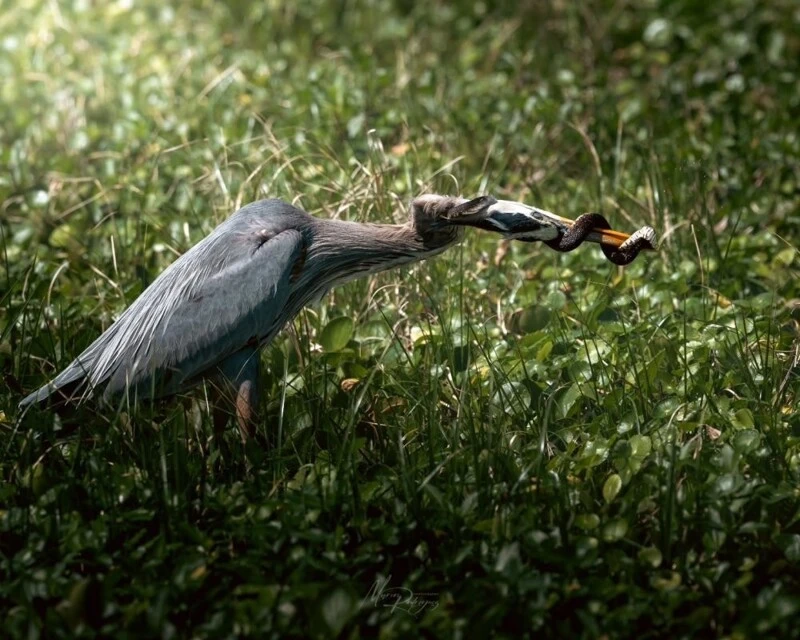 Житель штата Флорида Маркос Родригес работает инженером, но увлекается съемками дикой природы. В конце февраля он прогуливался с фотоаппаратом по Национальному парку Эверглейдс в штате Флорида. Неожиданно для себя он стал свидетелем схватки между цаплей и змеей. Большая синяя цапля поймала флоридскую полосатую неродию — неядовитую змею из семейства ужеобразных. Птица уже собиралась пообедать, когда змея внезапно дала ей отпор и обвилась вокруг ее шеи и клюва.