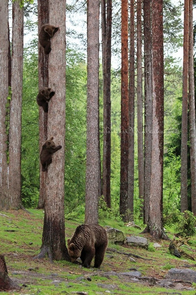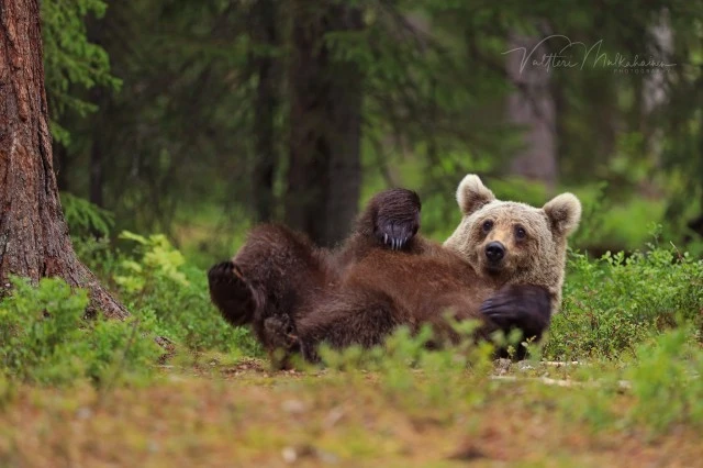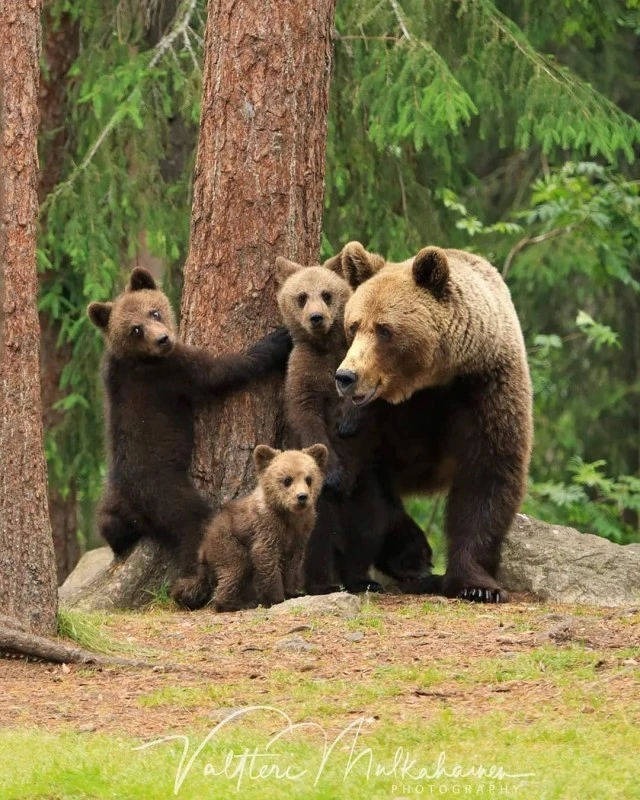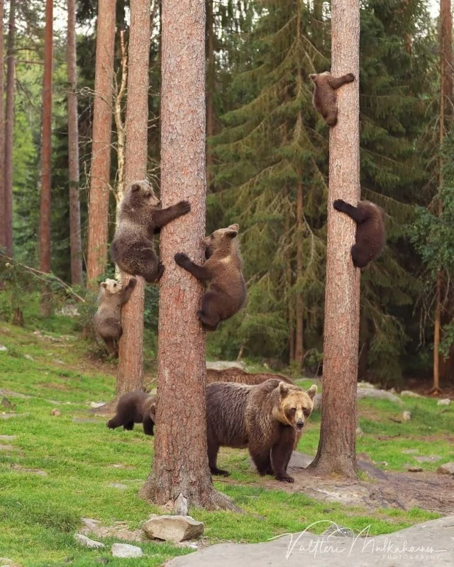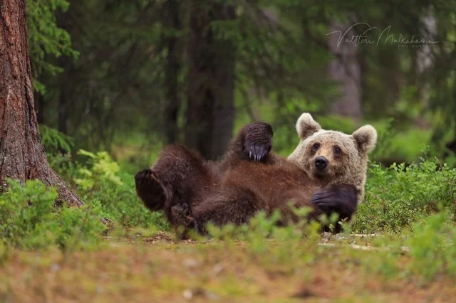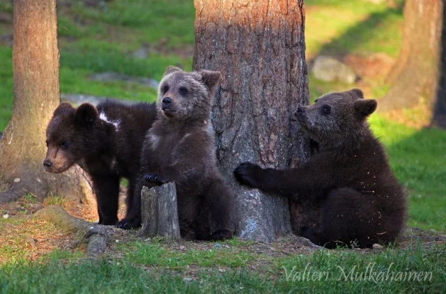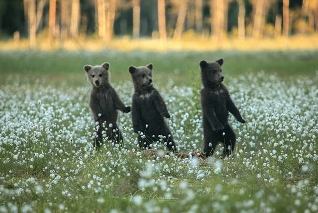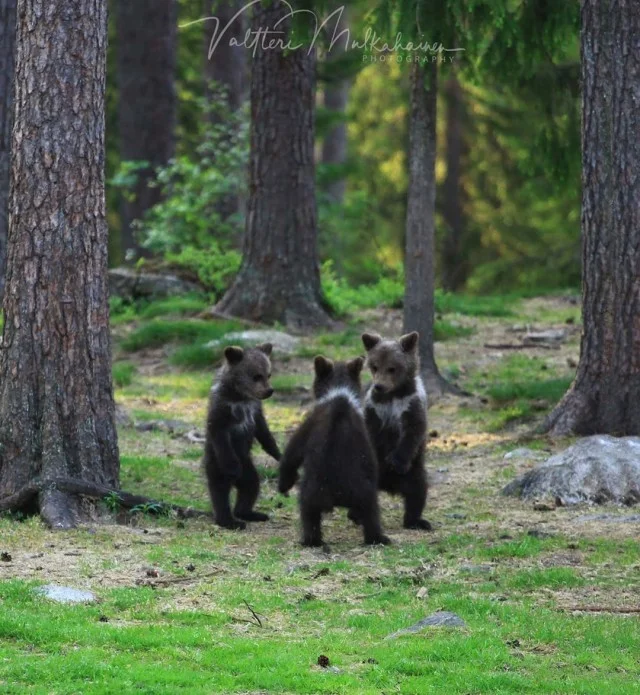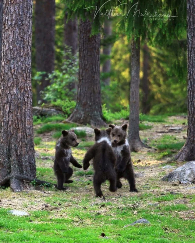 Валттери Мулкахайнен (Valtteri Mulkahainen) – учитель физкультуры из Соткамо, Финляндия, а ещё – фотограф дикой природы. Его фотоохота проходит в таёжных лесах, где можно из укрытия вести терпеливое наблюдение за бурыми медведями. Иногда удача улыбается, и снимки получаются по-настоящему удивительные. Однажды перед фотографом оказались трое медвежат, которые стояли на задних лапах и, будто, водили хоровод.