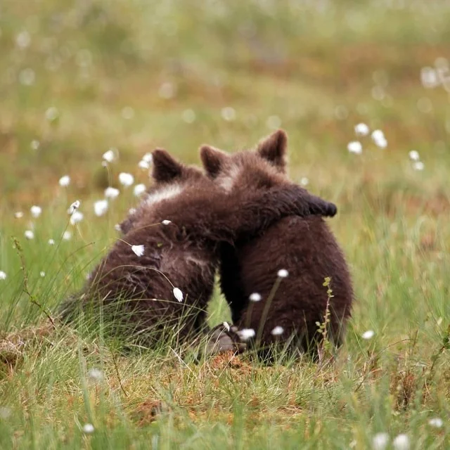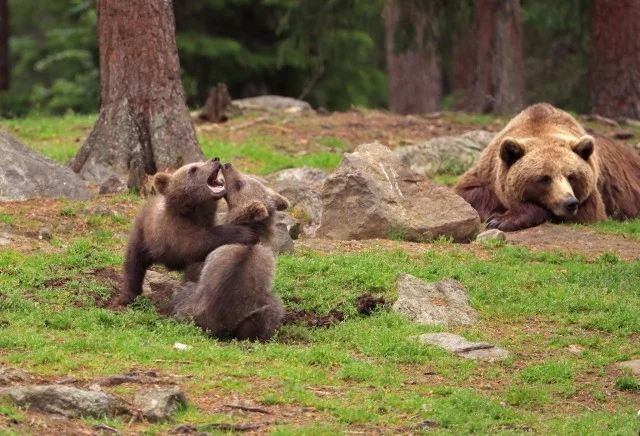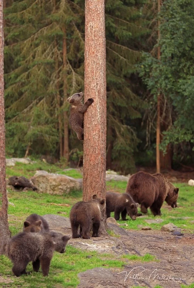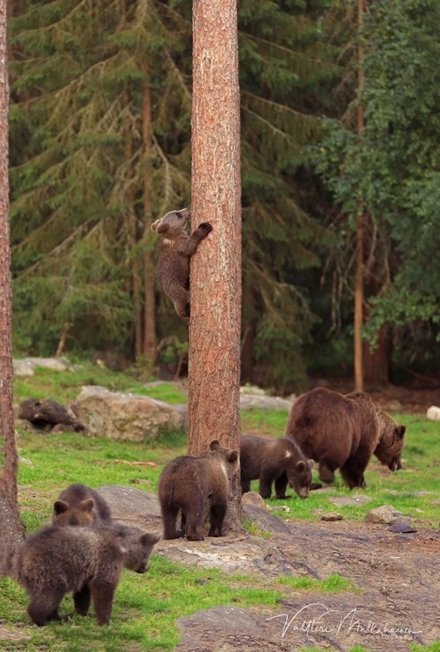 «Детёныши вели себя как маленькие дети. Они играли и даже по-дружески боролись. Я чувствовал себя как на детской площадке перед своим домом, где резвится детвора. В какой-то момент трое из них встали на задние лапы и начали толкать друг друга. Как будто они танцевали в кругу. Я фотографировал детёнышей с медведицей весь вечер и всю ночь рассказал», – Мулкахайнен. Он находился в укрытии в 50 метрах от действа и имел прекрасный обзор.