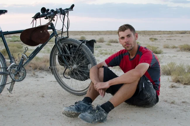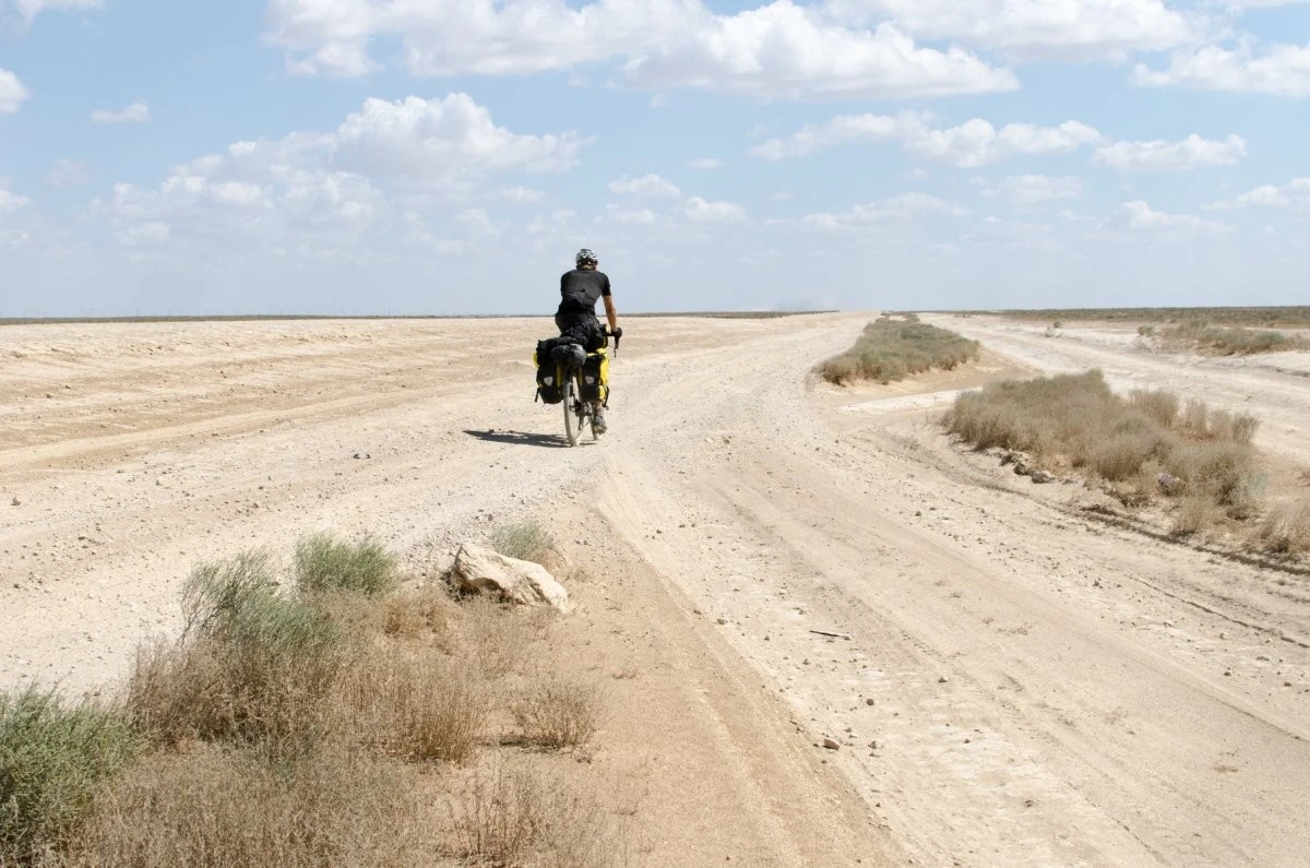В Баку, столице Азербайджана, Алекс Ганди встретил британского велосипедиста по имени Джон, который направлялся на восток. Вместе они на пароме пересекли Каспийское море и вскоре на велосипедах рассекали по безлюдным пустыням Узбекистана.