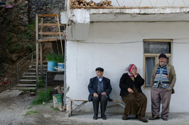 "Удивительно, насколько простая возможность поздороваться с кем-то из прохожих может полностью преобразить ваши впечатления о местности». Здесь жители разговаривают у обочины дороги в восточном турецком городе Шавшат.