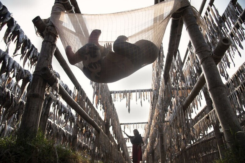 Мать сушит рыбу, чтобы прокормить ребенка, который тем временем спит в рыболовной сети.