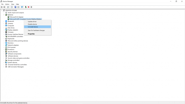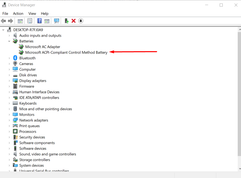Знайдіть пункт "Акумулятор з ACPI-сумісним управлінням" (або аналогічний за назвою) у розділі "Батареї". Якщо такого пункту немає, це може бути ознакою проблеми.